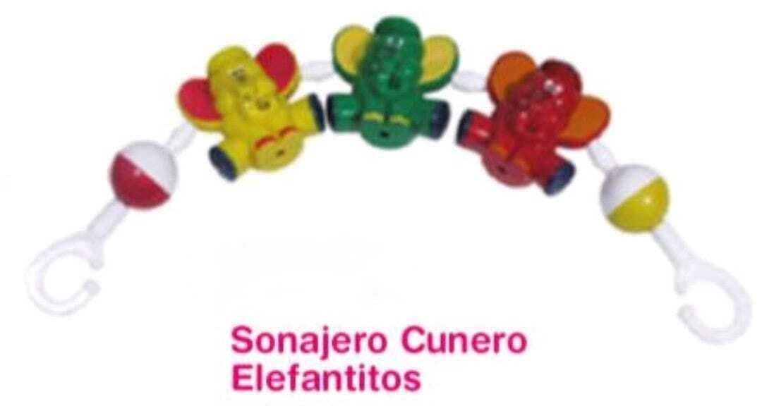 Divertido sonajero cunero con simpaticos elefantitos en color rosa o celeste.Ideal para la cuna o el cochecito.